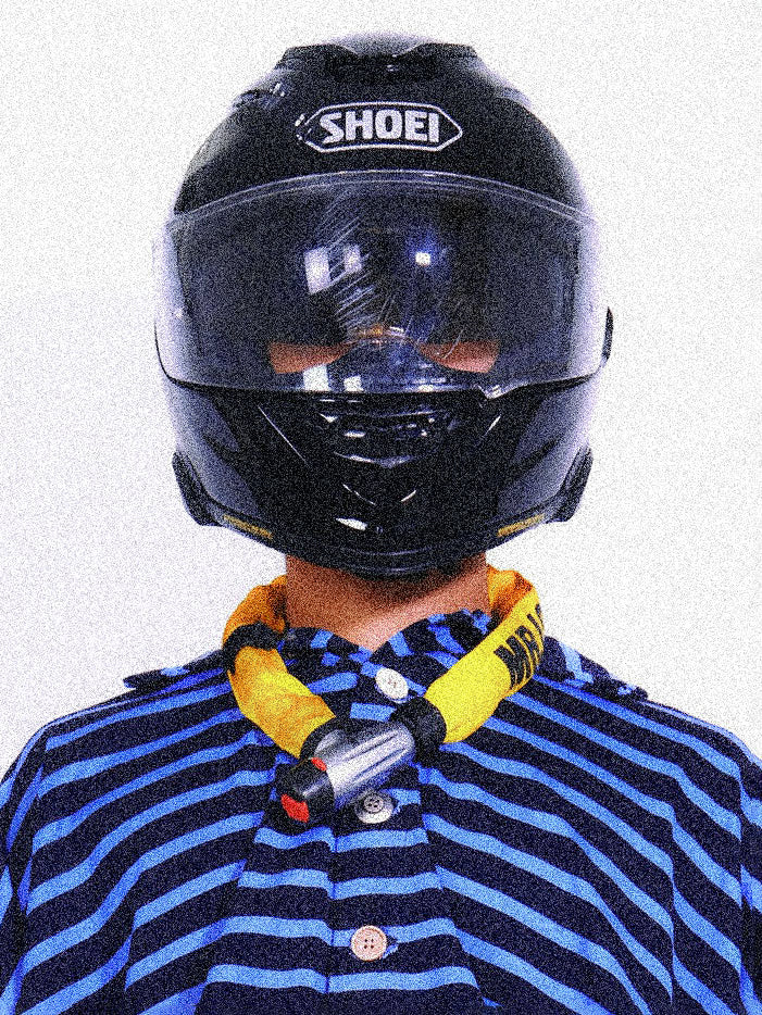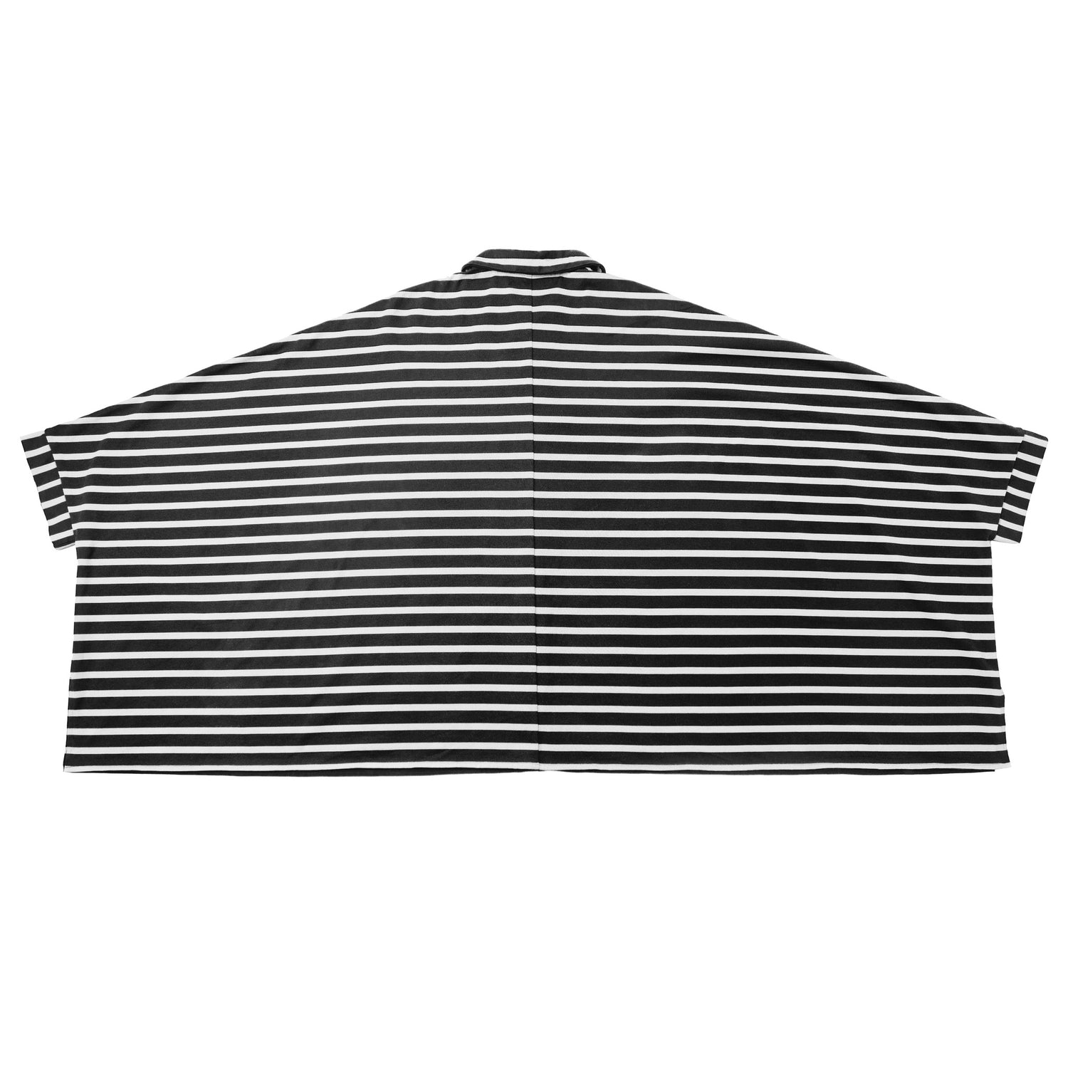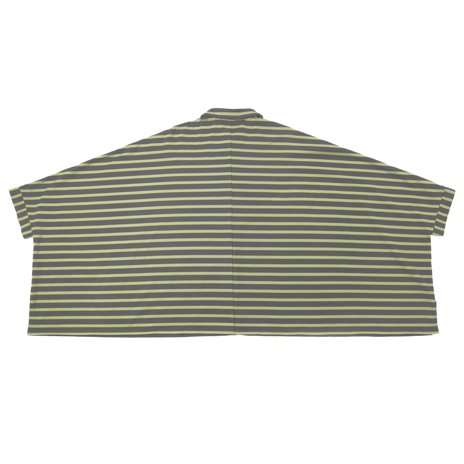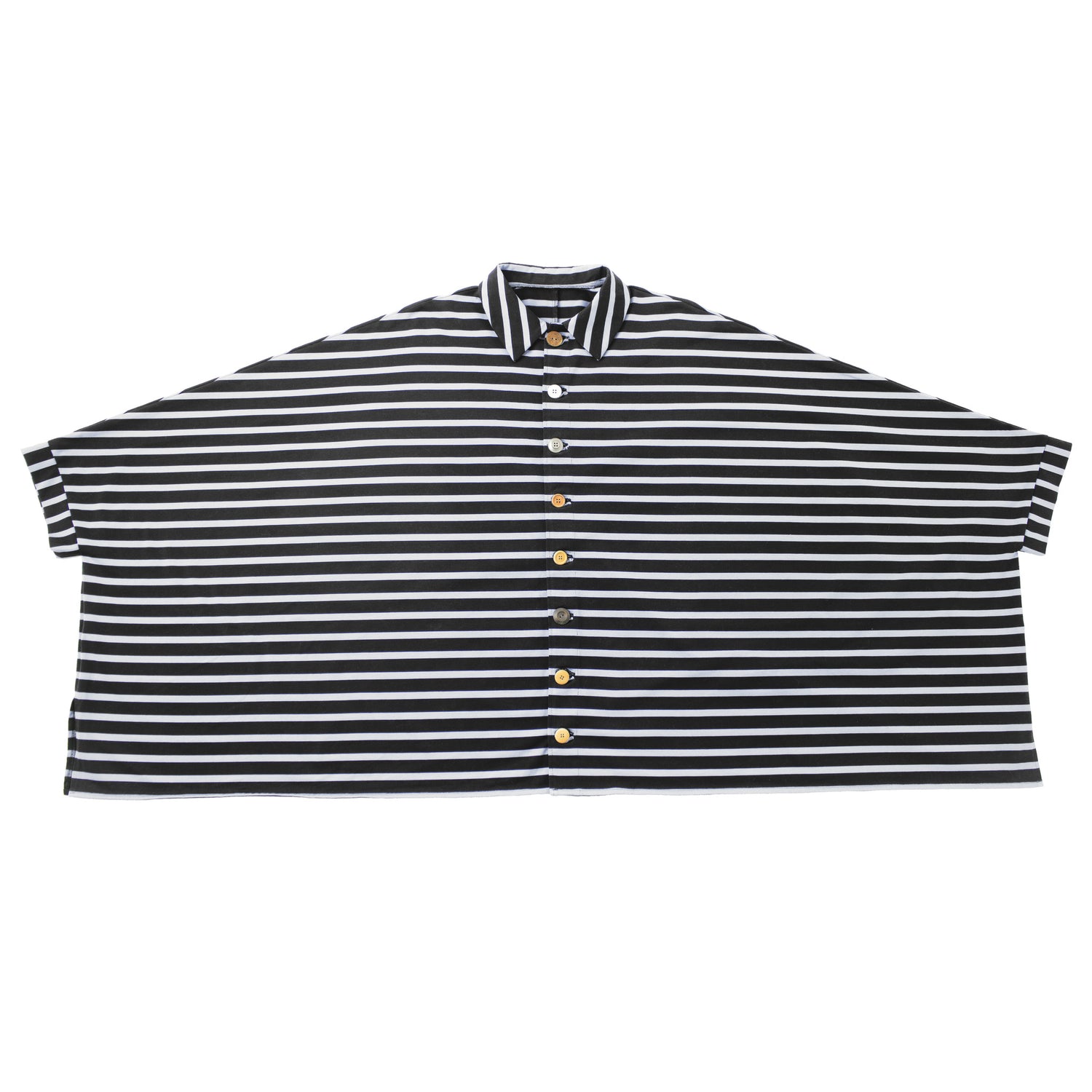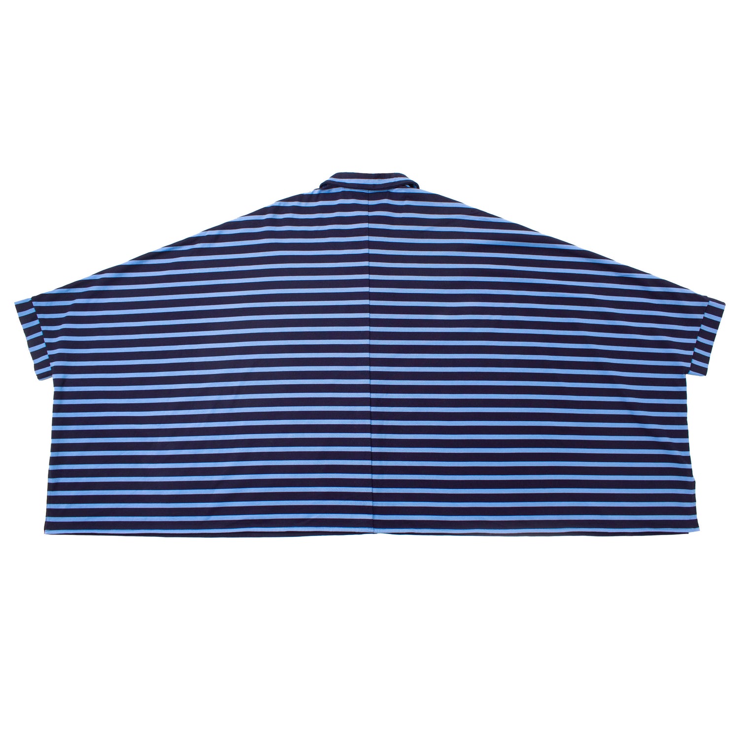 どんどん身幅は大きくなり、要素がすり替わるようにすれ違った人とボタンもすり替わっていったようなデザインとなっている。裾にはサイドスリット入り。この服のシルエットとボーダーは、着用時に一体どのような立体になってるか分からない曖昧さが体感できる。この点に人とのすれ違い(データの動き)は、自分の認識外でも常に発生している不明瞭な情報というモザイク性を投影した。